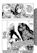 Jericho ponders on whether the situation is much graver than thought, and is abruptly interrupted by Ban, who confirms. He reveals that he also healed himself with the Holy Knights' Incantation Orbs, and has stolen some of them. As the two turn to confront Ban, he yells a warning in vain as Meliodas attacks, further injuring them. The Sin of Greed tries to fight, only for him to be instantly severed into two by the apparently mindless Sin of Wrath. Elizabeth and Hawk question each other about Meliodas' strange behavior. The princess closes her eyes as the destruction around them continues, and upon opening them again, discovers that the entire area has been leveled, with the area where she and Hawk where on, being an elevated surface compared to the rest of leveled area. Meliodas, standing in front of her, leans close, and smells her. Then seeming to notice something, he raises his left arm, manipulating the black-colored substance on it to form a single wing, and flies with great speed.